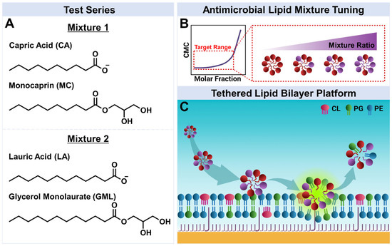 Experimental strategy. (A) Molecular structures of the tested antimicrobial lipids: mixtures of capric acid (CA) and monocaprin (MC), and mixtures of lauric acid (LA) and glycerol monolaurate (GML). (B) Optimizing antimicrobial lipid mixture ratios to improve potency based on CMC mapping of binary mixtures. (C) Tethered lipid bilayer membrane (tBLM) platform composed of cardiolipin (CL), phosphatidylglycerol (PG), phosphatidylethanolamine (PE), and other lipids.