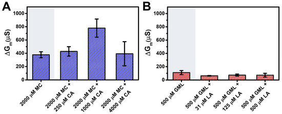 However, notably, the 2000 µM MC + 4000 µM CA treatment yielded a smaller maximum ΔGm shift of 393 ± 182 µS despite an appreciably higher total MC/CA concentration. In other words, CA addition enhances the membrane-disruptive activity of MC up to an intermediate CA concentration but its potentiating effect was diminished, and to some extent counteracted, at higher CA concentrations. This trend suggests a ratio-dependent effect although other possibilities exist like solubility limits as well. Conversely, for GML/LA mixtures, the maximum ΔGm shift of 500 µM GML was 111 ± 31 µS and decreased to around 60–70 µS for 500 µM GML plus 31–500 µM LA (Figure 3B). This trend indicates that LA addition has a modest diminishing effect on the membrane-disruptive activity of GML across all tested LA concentrations.