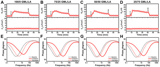 In addition, we tested the effects of 100 mol% GML treatment (equivalent to 160 µM concentration) and observed an initial ΔGm shift of 15 µS that gradually declined to around 10 µS and returned to near-baseline values upon buffer washing (Figure 5A). There were also negligible ΔGm shifts throughout the interaction process. Nearly identical ΔGm and ΔCm shifts were observed in the cases of 75/25, 50/50, 25/75 mol% GML/LA mixtures that were equivalent to 200, 320, and 520 µM concentrations, respectively (Figure 5B–D). The corresponding Bode phase plots showed similar levels of membrane disruption across the tested GML/LA mixtures and frequency-at-minimum-phase shifts were markedly smaller than in the 75/25 and 50/50 mol% MC/CA mixture cases, while the shifts largely recovered upon buffer washing (Figure 5E–H).