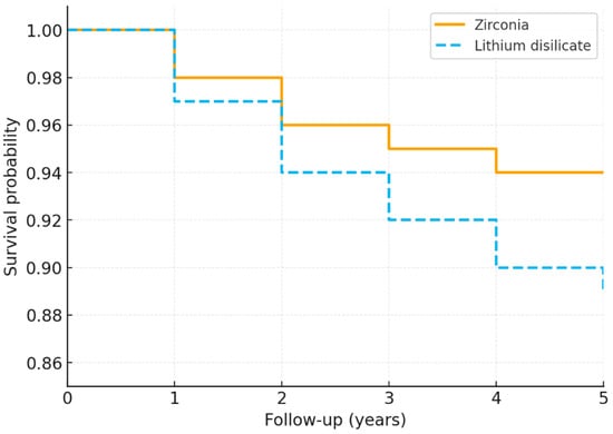 Kaplan–Meier survival curves for zirconia and lithium disilicate prostheses over a 5-year follow-up period.