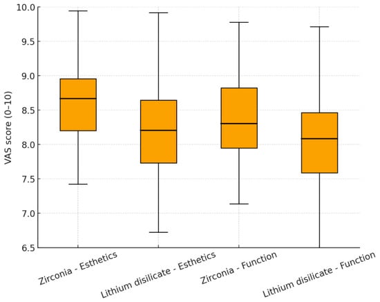 VAS satisfaction scores for esthetics were 8.6 ± 0.6 for zirconia and 8.2 ± 0.7 for lithium disilicate restorations (p = 0.072). For function and chewing ability, mean VAS scores were 8.4 ± 0.7 in the zirconia group and 8.0 ± 0.8 in the lithium disilicate group (p = 0.085) (Figure 3).