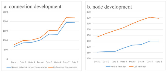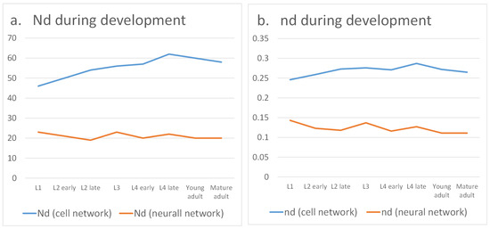 Figure 2 illustrates this developmental process, and the quantitative changes are summarized in Table 1. According to the reconstructions reported by Witvliet et al. [16], the nervous system expands from an early configuration of 161 neurons connected by 675 synapses to a mature network comprising 180 neurons and 1933 synapses (Figure 3). A similar trend is observed at the cellular level, with both cell numbers and connections nearly doubling from larval to adult stages. These anatomical data clearly demonstrate an overall increase in size and density, reflecting the broad structural maturation of the system.