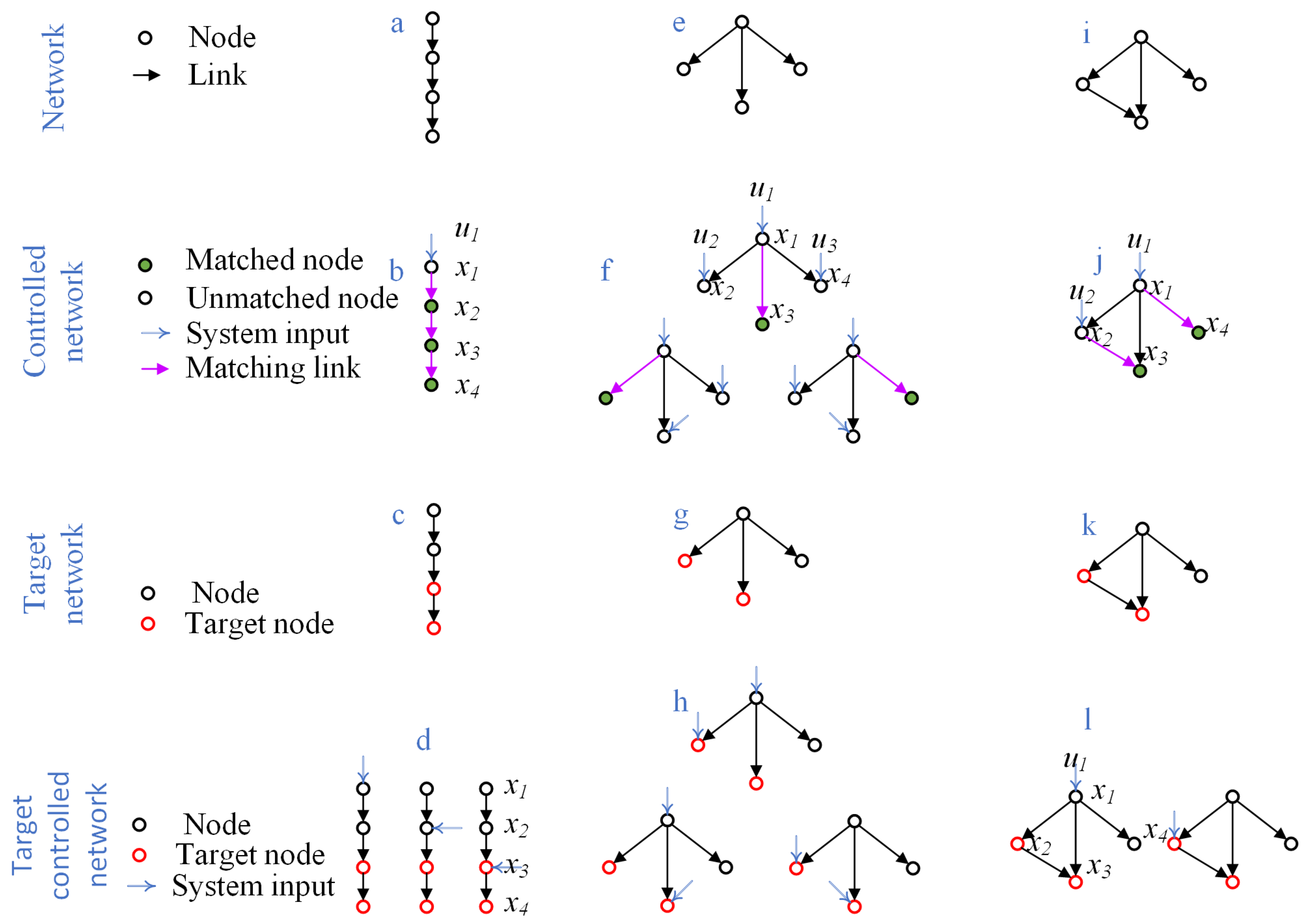 Gao et al. [12] showed that multiple target nodes can sometimes be controlled by a single driver node, depending on the distances within the network. For example, in the chain network of Figure 1c, if nodes 3 and 4 are designated as targets, then controlling node 1, 2, or 3 suffices to drive both targets, yielding and . In contrast, in the network of Figure 1g, if nodes 2 and 3 are targets, at least two driver nodes are required (Figure 1h). For global controllability of the same network, however, three nodes must be controlled (Figure 1f).