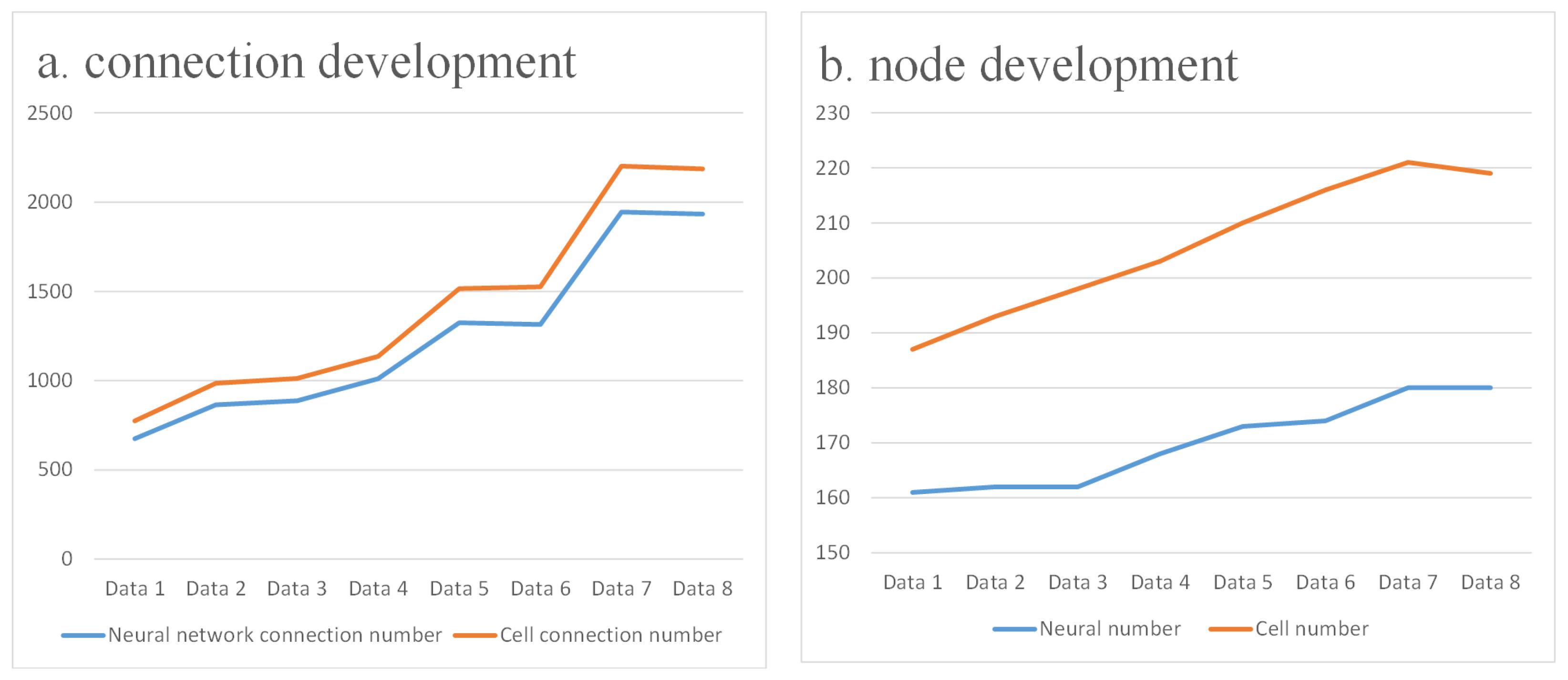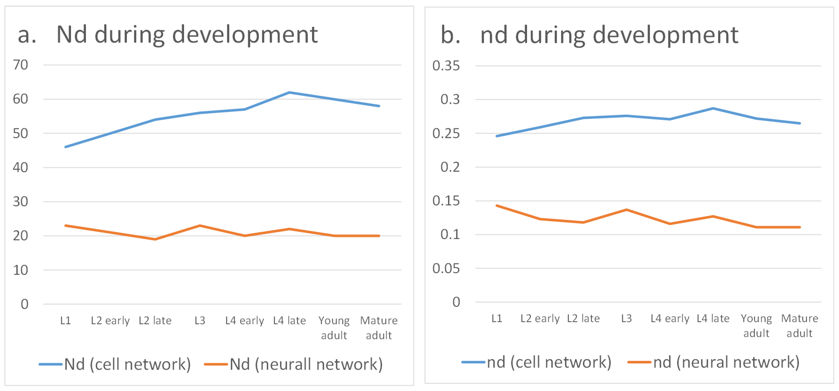 The nematode C. elegans passes through four larval stages—L1, L2, L3, and L4—before reaching adulthood [30]. Across these stages, its nervous system undergoes marked structural expansion. The number of neurons and synapses increases steadily, leading to greater connectivity and progressively refined neural circuits. By the adult stage, the network is fully established, supporting coordinated functions such as locomotion, sensory processing, and behavioral regulation. Thus, the developmental trajectory of C. elegans represents a transition from a relatively simple architecture to a mature and functionally sophisticated nervous system.
