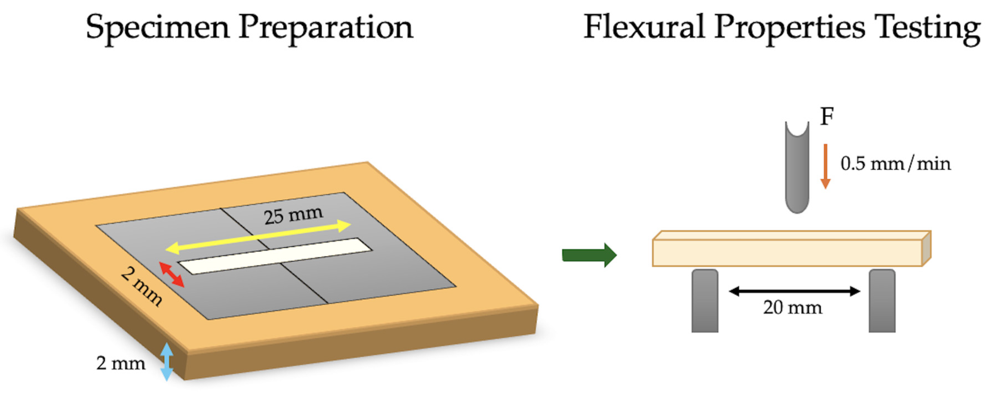 2.2. Flexural Properties’ Specimen Preparation and Testing