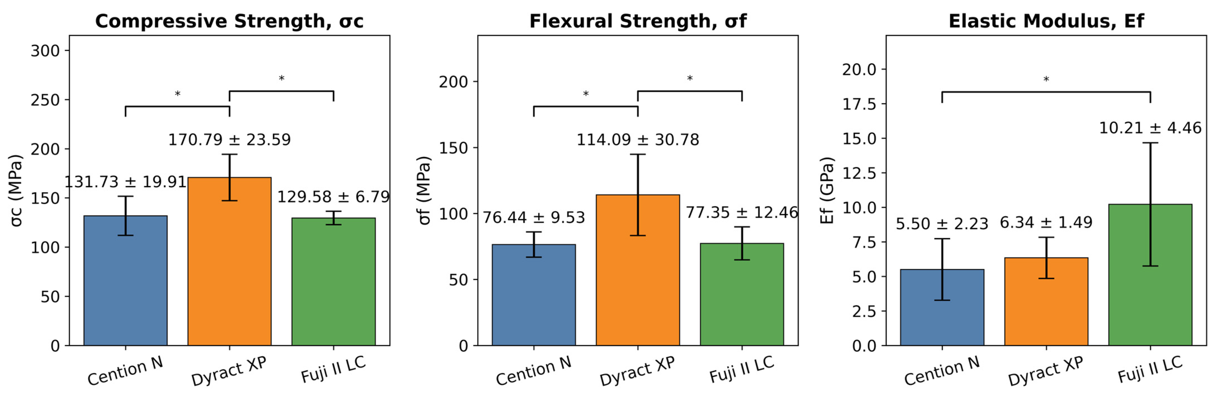 | Cention N-Fuji II LC | 4.71 | 0.21 | 9.22 | 0.04 * | |||