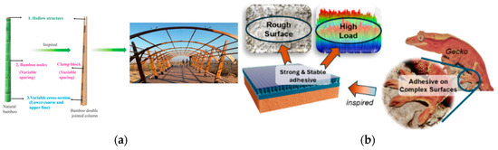 (a) Bamboo-inspired design in structural engineering [21]. (b) Representation of gecko-inspired adhesive [22].