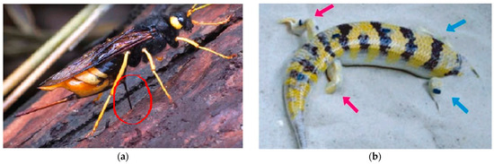 (a) Wood wasp depositing its eggs into a tree [25]. (b) Sandfish diving into sand [26].