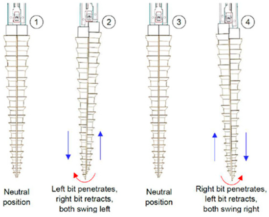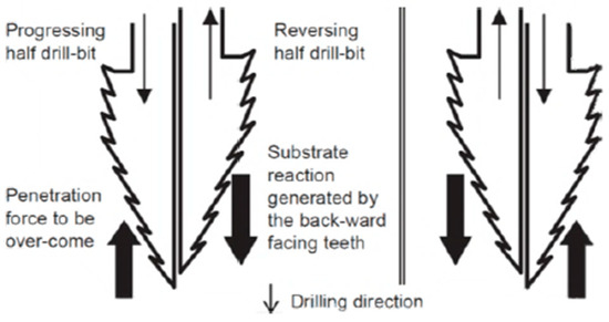 Laboratory studies have demonstrated that the double-reciprocating drilling (DRD) mechanism inspired by the wood wasp may function with 50% less top force than rotary drilling approaches, making it ideal for low-gravity extraterrestrial conditions [12,24]. Below, Figure 5 illustrates the initial concept of the drill. Furthermore, energy consumption was greatly reduced due to this design, with some prototypes requiring only 3 W of power to achieve a penetration depth of up to 2 m [12]. This efficiency is especially beneficial for space missions, where power supply constraints are a major problem.