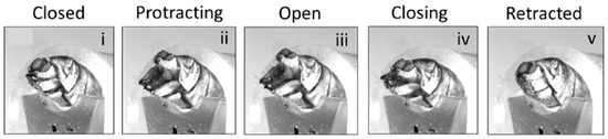 Experimental investigations on the mechanical performance of the ovipositor revealed that the dorsal and ventral valves provide distinct functions during penetration. The dorsal valve offers stability and anchoring, whereas the ventral valve carries out the major cutting and gradually reaches deeper into the stroma [35]. The close-up view image in Figure 8 illustrates the opening and closing cycles. High-resolution imaging and material testing revealed that the valves are strengthened with a unique cuticle composition that increases their wear resistance and durability [36]. Incorporating this approach into a robotic drilling system resulted in the creation of an autonomous penetration device that employs a reciprocating motion to reduce the frictional resistance and improve the efficiency of drilling in granular and compacted soils [37].