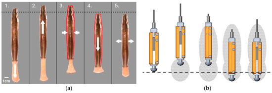 The clam’s burrowing model uses a coordinated cycle of valve contraction and expansion. Figure 11a depicts the initial stage in which the valve is opened to support the soil and establish a penetrating anchor. The foot then extends downward, entering the substrate, while the end anchor holds the clam in position. The subsequent constriction of the valve causes local fluidization, which occurs when the surrounding matrix transitions from a solid to a liquid state. This fluidized zone greatly reduces the drag, allowing the clams to migrate to deeper depths with less force [43,44,45,46].