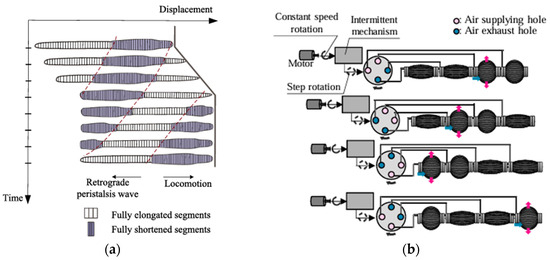 (a) Locomotion illustration of earthworms during burrowing [67]. (b) Appearance of robot locomotion and new pneumatic valve [63].