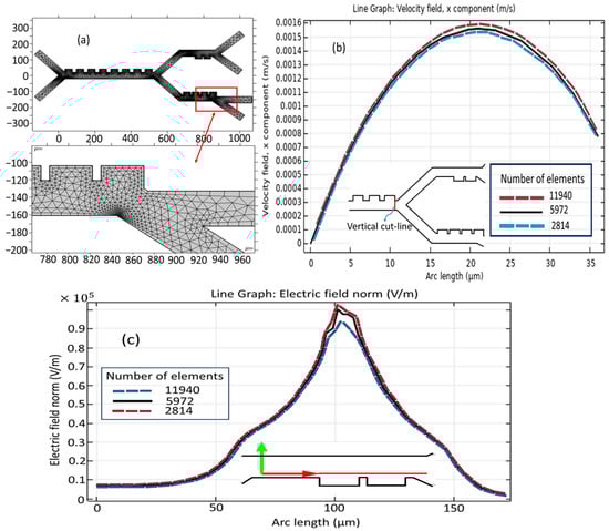 All the results were generated using a highly developed grid of computation, as depicted in Figure 3a, and the computation grid is made up of inner triangular elements that enable the modeling process. Care was taken to select a standard element size for the appropriate meshing of the proposed model. This mesh consists of 5972 domain elements presenting the volumetric accounts inside the model and 500 boundary elements constituting the interface of the domain from the surroundings. The grid independence study is conducted utilizing a varied number of mesh elements. Figure 3b,c illustrate the velocity profile in the x-direction and electric field intensity along the vertical cut line. As demonstrated in Figure 3b, the disparity in the channel’s velocity profile when employing a range of grid resolutions is insignificant. Therefore, a configuration of the channel comprising 5972 constituents with an average grid was chosen.