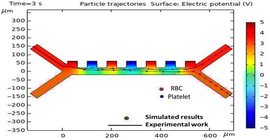 To validate the computational model, its predictions were compared against the experimental data published by Piacentini et al. []. The comparison was specifically aimed at the trajectories of erythrocytes (RBCs) and platelets (PLTs), as indicated in Figure 4. Table 2 shows the dielectric properties of the PLTs and RBCs in the experimental work of Piacentini et al. [].