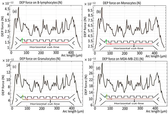 Figure 6 and Figure 7 show the dielectrophoretic force experienced by each distinct cell species as they traverse the initial phase of the microchannel, an evaluation conducted over the duration of the simulation period, exactly analyzed along the vertical and horizontal red cut lines. It becomes obvious that B-lymphocytes and Monocytes show a relatively diminished response to the DEP force, as evidenced by the significantly lower values ranging from 11 × 10−12 [N] to 24 × 10−12 [N], as shown in Figure 6a,b, and 4.5 × 10−12 [N] to 9.5 × 10−12 [N], as depicted in Figure 7a,b. Conversely, in a similar analysis, it is observed that the MDA-MB-231 cells and Granulocytes exhibit the most pronounced susceptibility to the DEP force, which is verified by the notable elevation of the DEP force within the magnitude range of 75 × 10−12 [N] to 35 × 10−12 [N], as illustrated in Figure 6c,d, and 14 × 10−12 [N] to 30 × 10−12 [N], as reflected in Figure 7c,d, respectively. Additionally, it is noteworthy that the influence exerted by the DEP force persists for a duration of 4.5 s.