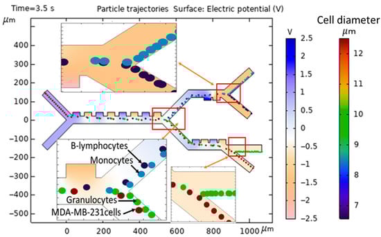 Figure 8 shows a detailed illustration of the separation of various cell types within the microseparator that has been suggested for this study. As clearly evidenced by the comprehensive simulation that is fully presented in Figure 7 and Figure 8, the MDA-MB-231 cells, which are depicted within dark red circles for clarity, as well as the Granulocyte cells, represented by green circles, experience the most substantial DEP force, a result of the electrodes being driven at 1.5 V, which consequently results in their deflection towards the lower outlets of the microseparator. Following this initial separation, the MDA-MB-231 cells and Granulocyte cells advance to the third stage, where a total of four active electrodes are engaged at a voltage of 1.2 V, which subsequently facilitates their exit through outlet 4 and outlet 3, respectively, thus ensuring an efficient separation process. Meanwhile, the B-lymphocytes, illustrated in dark blue, as well as the Monocytes, shown in blue, experience comparatively less deflection within the confines of the main channel, which leads them to transition to the second stage with a voltage of 2.5 V and ultimately exit via outlet 1 and outlet 2, respectively, highlighting the selective nature of the microseparator. Furthermore, all types of cells undergo negative DEP at a frequency of 70 kHz, a phenomenon that is critical to their movement. Due to the presence of a negative DEP, the cells are effectively repelled from the high-electric-field regions that are localized at the surfaces of the electrodes, thereby ensuring that the cells do not sustain any damage during the separation process. The design of a multi-stage separation system, with outlets for specific WBC subtypes, is a strategic choice to address the central challenge of dielectric property overlap in label-free CTC isolation. A single-stage device attempting to separate CTCs from a bulk WBC population would suffer from a significant contamination, as the dielectric signatures of Monocytes and B-lymphocytes can closely resemble those of various CTCs. Our sequential approach mitigates this by first removing the most dielectrically distinct populations (Stage 1), followed by a finer separation to resolve the overlapping subtypes (Stages 2 and 3). This ensures that the final CTC outlet is of high purity. Furthermore, this architecture provides the added potential to correlate CTC numbers with specific immune cell counts from the same blood sample, offering a more comprehensive liquid biopsy platform.