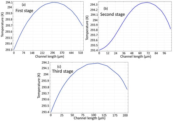Figure 10 shows the temperature profile across the channel length calculated separately for three microchannels. It is clear that the temperature gradient along the microchannel is approximately 1 K, which maintains the cell solution within a safe range to ensure viability [].