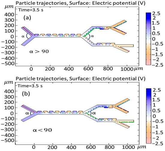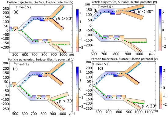 In this section, the influence of the variability of both the input and output angles on cell trajectories is investigated. Figure 15 shows the effect of changing the input angle () in the first and second (or third) stages when (a) and (b) . As is clear from Figure 15a, the angle change leads to the entrance of the Granulocytes to the second stage, and this results in an unsuccessful separation of the cells. In Figure 15b, the adjustment of the angle does not yield any appreciable alterations in the paths taken by the cells. Figure 16 shows the simulation of the effect of changing the output angle () when (a) , (b) , (c) , and (d) . The initial output angle of second and third stages is set to and , respectively. As is clear from Figure 16a, increasing the output angle to does not have any effect on the cell trajectory, but, in case when the angle changes to (Figure 15b), both Monocytes and B-lymphocytes simultaneously exit from the outlet (outlet 1). In Figure 16c,d, when the output angle of the third stage () changes to (c) and (d) , the variation does not affect the trajectory of cells. It must be noted that, in Figure 16c, the Granulocytes do not reach the outlet in 3.5 s.