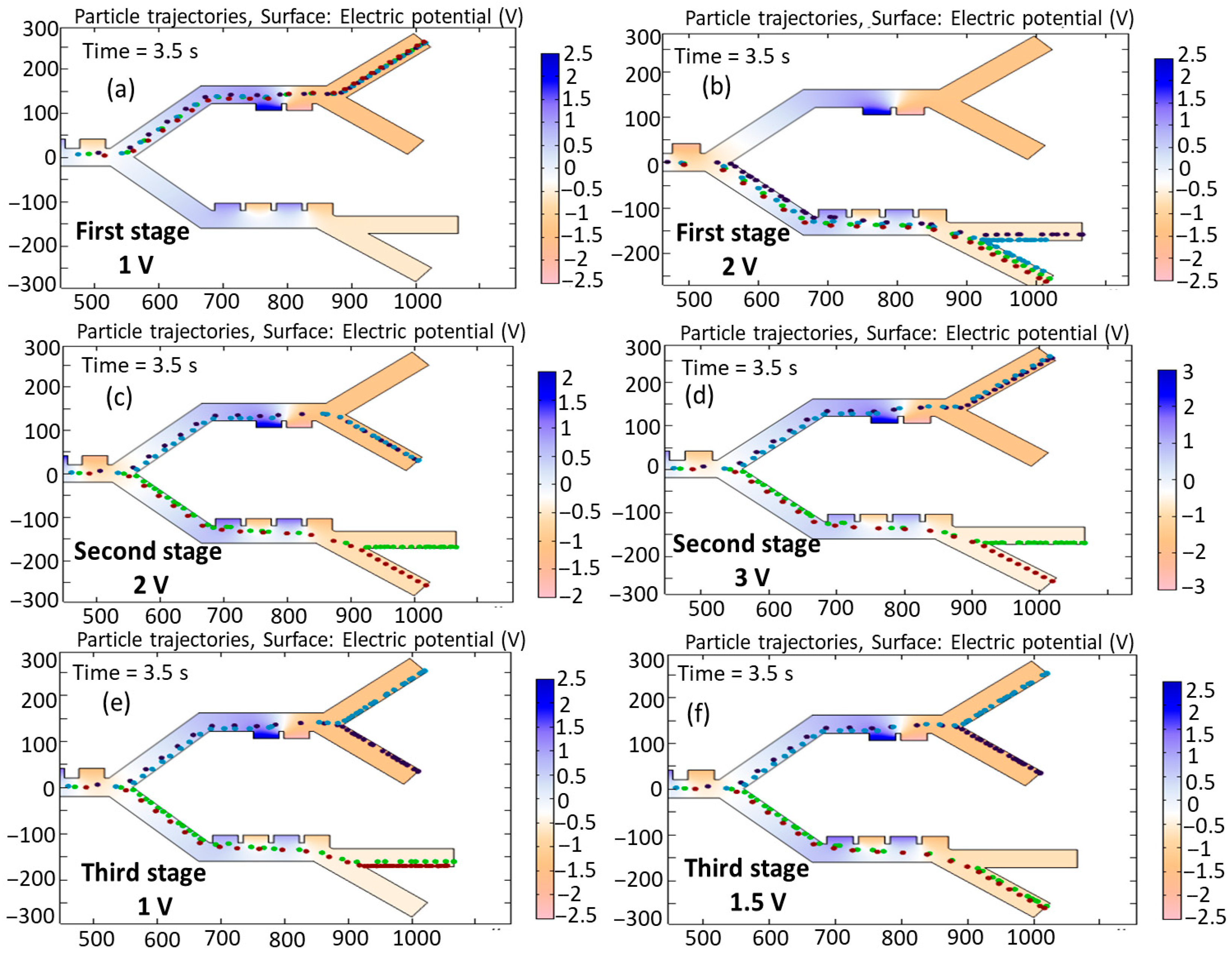 3.6. The Effect of Changing the Width of First, Second, and Third Stages on the Cell’s Trajectories and DEP Force