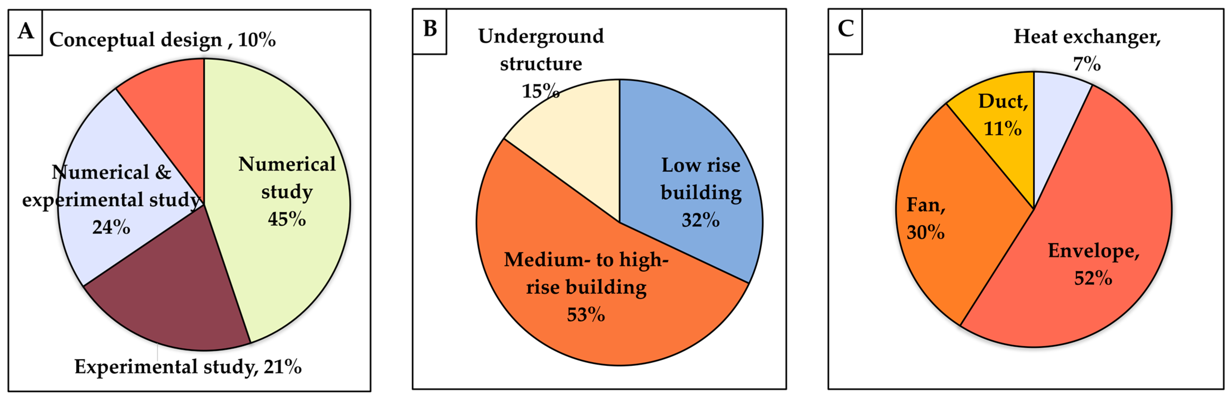 - Laboratory or experimental testing coupled with CFD study: A much smaller proportion of studies conducted both experiments and a CFD study rather than CFD-only work. To increase reliability, future research should start with a CFD study for the design of experiments and sensitivity analysis, then reproduce the most optimized case as a prototype for experimental testing.