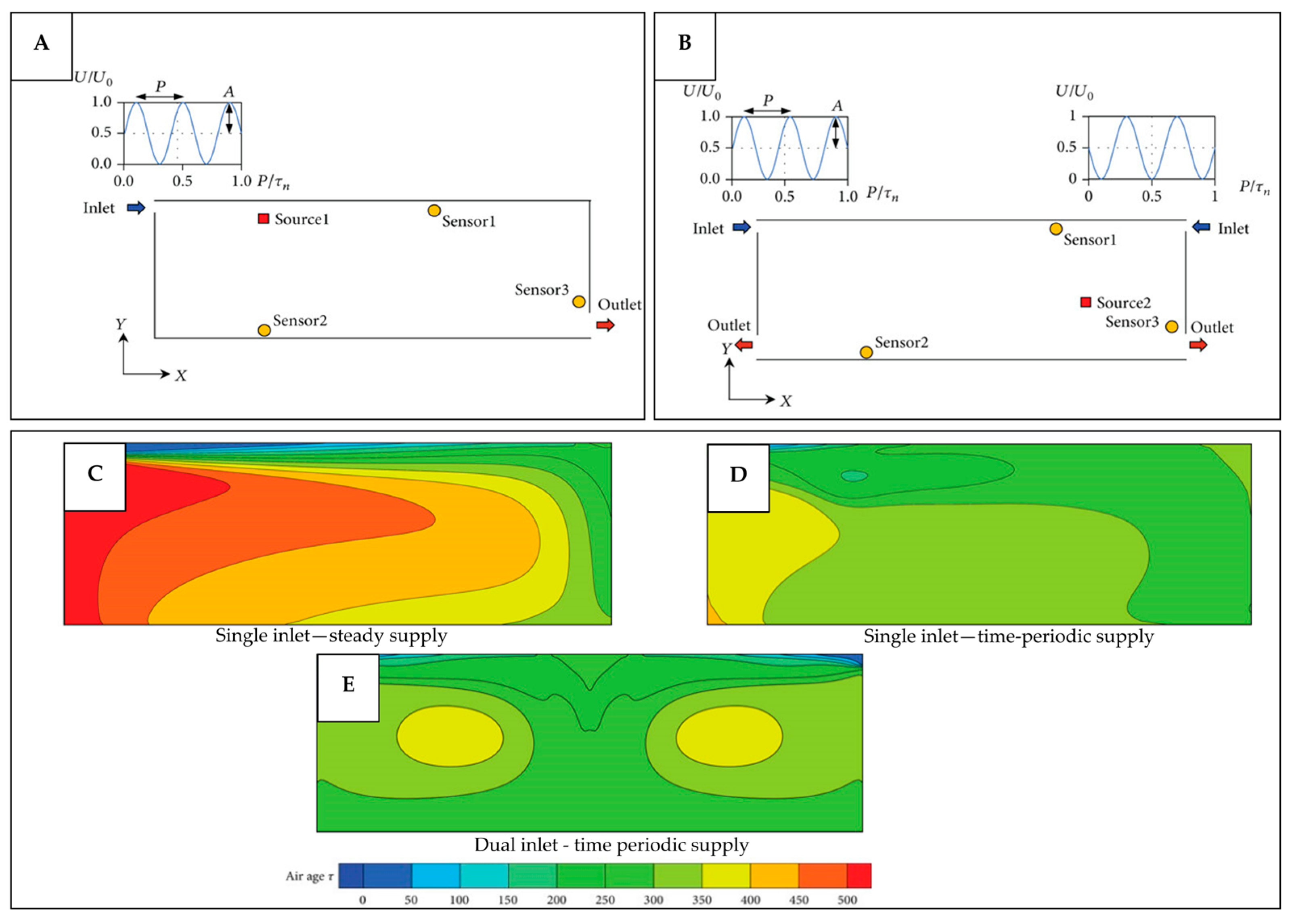 | Periodic inhalation-exhalation. | Time-periodic ventilation system with single or dual inlets. | Rooms or any enclosed space. | More uniform velocity distribution; reduced pollutants in stagnant zones; higher ventilation efficiency; lower age of air. | Computationally demanding to simulate; impact on occupants’ thermal comfort not investigated; the performance is dependent on the period and amplitude used. | [145] |