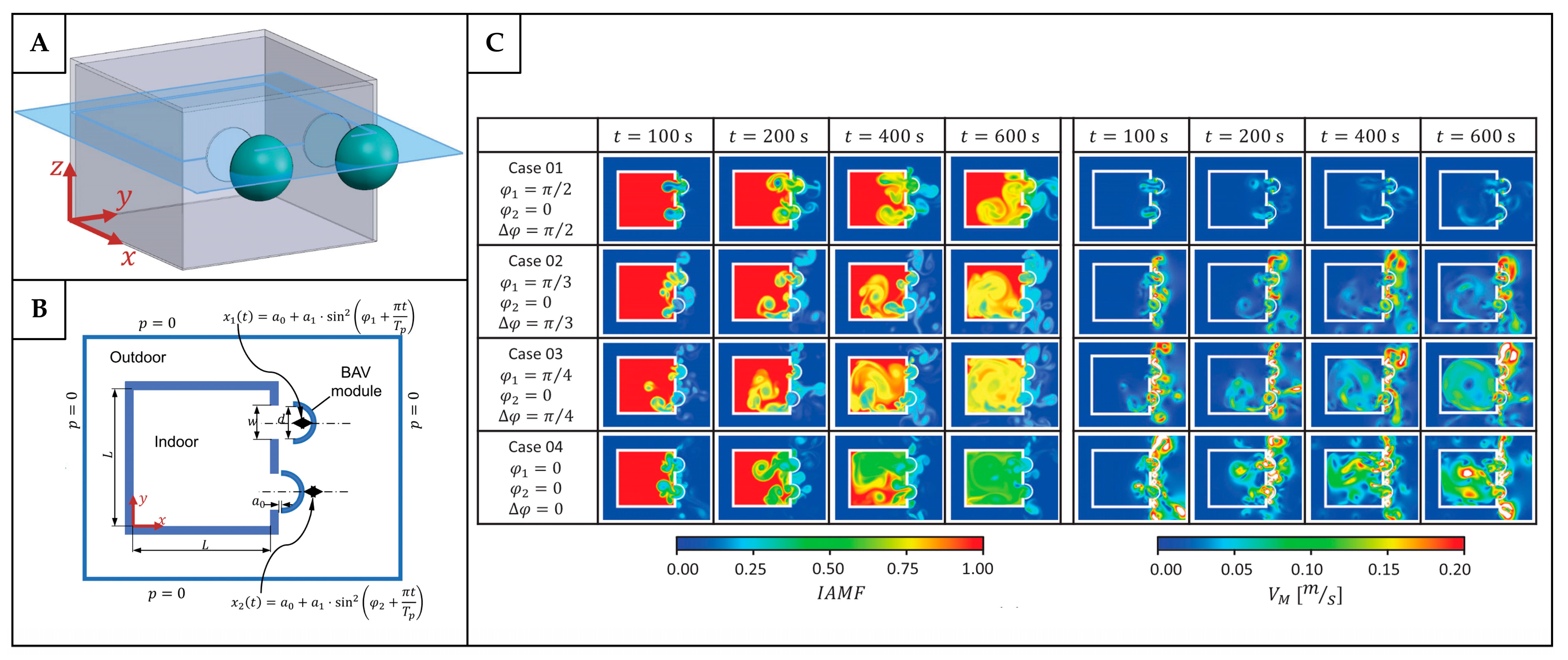| Volume variation induced pressure gradient. | Biomimetic active ventilation (BAV) modules that separate indoor and outdoor environments. | Rooms or any enclosed space. | Faster air exchange rate between indoor and outdoor environments. | The model assumes advection-dominated transport; natural ventilation is only effective with wind inflow; the impact on occupants’ thermal comfort is not considered. | [131] |
