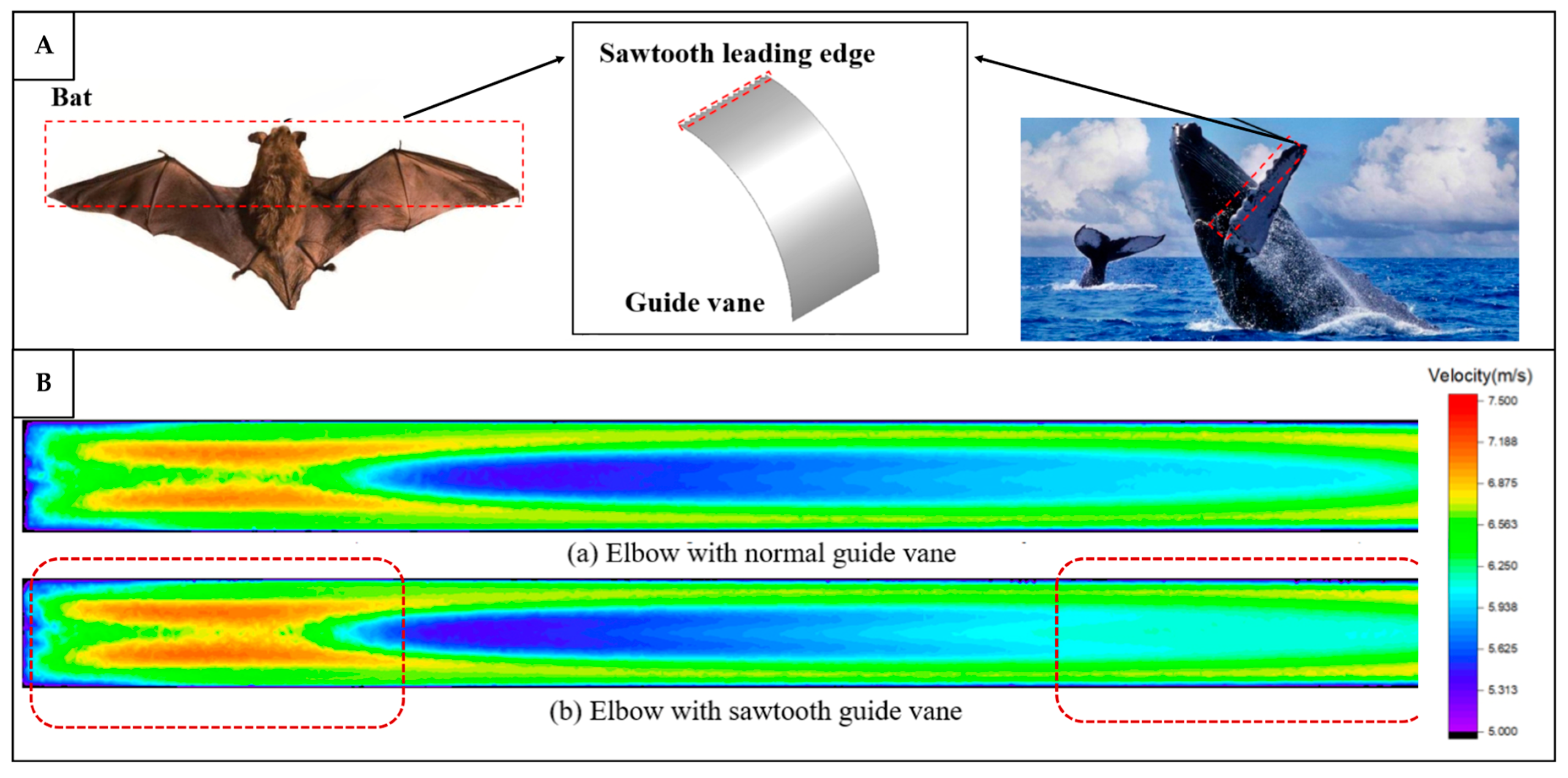 | Bat wings and whale pectoral fins. | Sawtooth structures. | Guide vanes for ventilation ducts. | Reduced local resistance coefficient; improved uniformity of the velocity distribution; reduced energy dissipation rate. | Resistance reduction depends on duct dimensions; local resistance is based on the average value; the noise effect is not considered. | [148] |