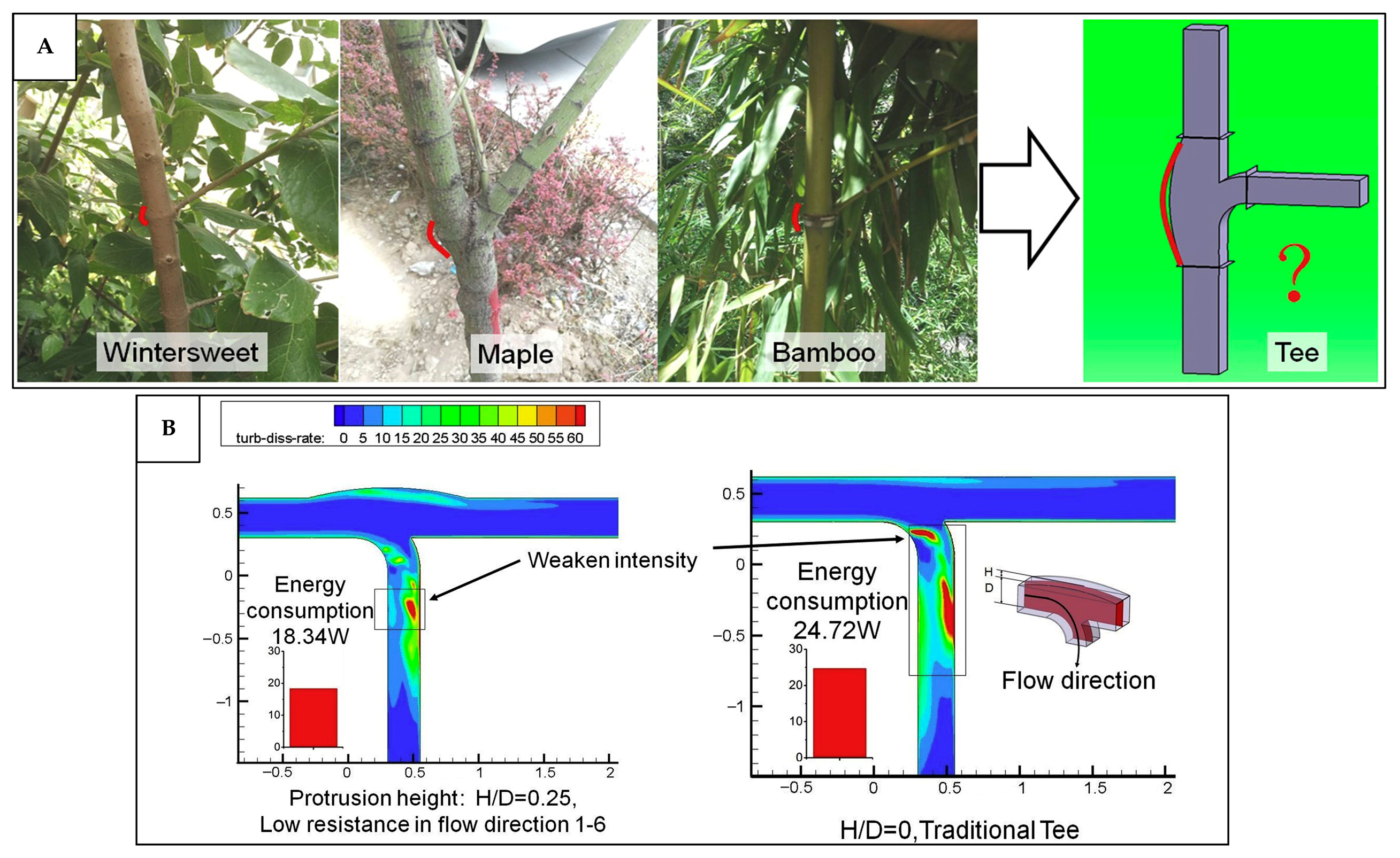 | Tree branch. | Protrusions. | Ventilation ducts. | Reduced resistance and energy consumption; smaller energy dissipation rate. | Excessive protrusions can cause flow deformation and increase resistance instead of reducing it. | [149,208] |