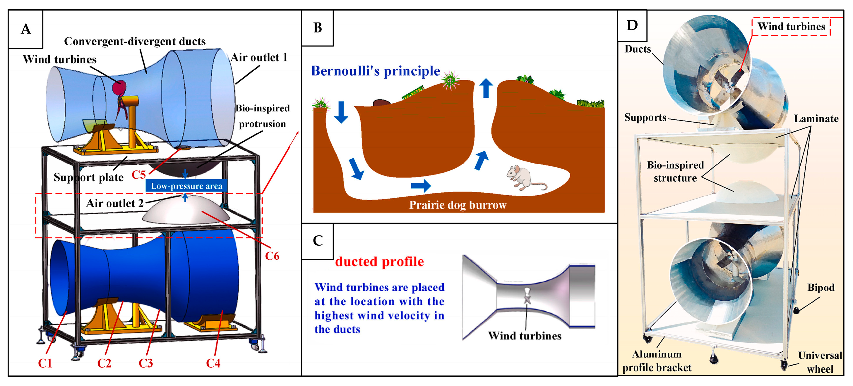 | Prairie dog burrow geometry. | Elevated entrance and convergent-divergent channels. | Duct with contraction–expansion sections and protrusions. | Increased mass flow rate; accelerated airflow; reduced turbulent kinetic energy. | Structural complexity; protrusions and sudden geometric changes may cause noise, vibration, and flow instability. | [150,151] |