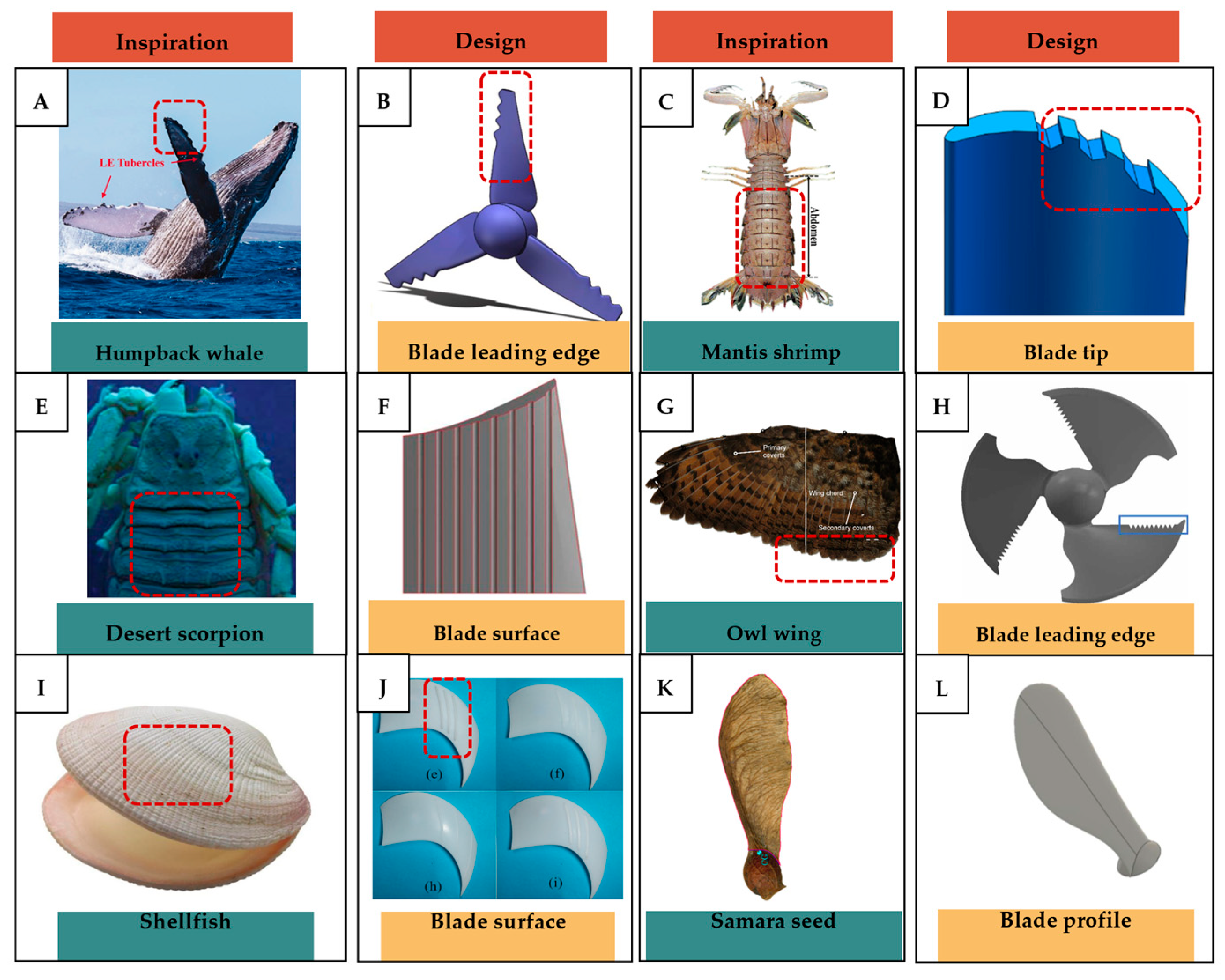 | Non-smooth structures | Fan | The scalability depends on the type of fans and the location the bio-inspired structure is being applied to, but larger fans require more manufacturing cost. | Smaller fans tend to be more reliable because they have been more widely tested compared to larger fans. | The efficiency of the bio-inspired structure is dependent on fan types and the type of non-smooth structure, regardless of the scale. |
