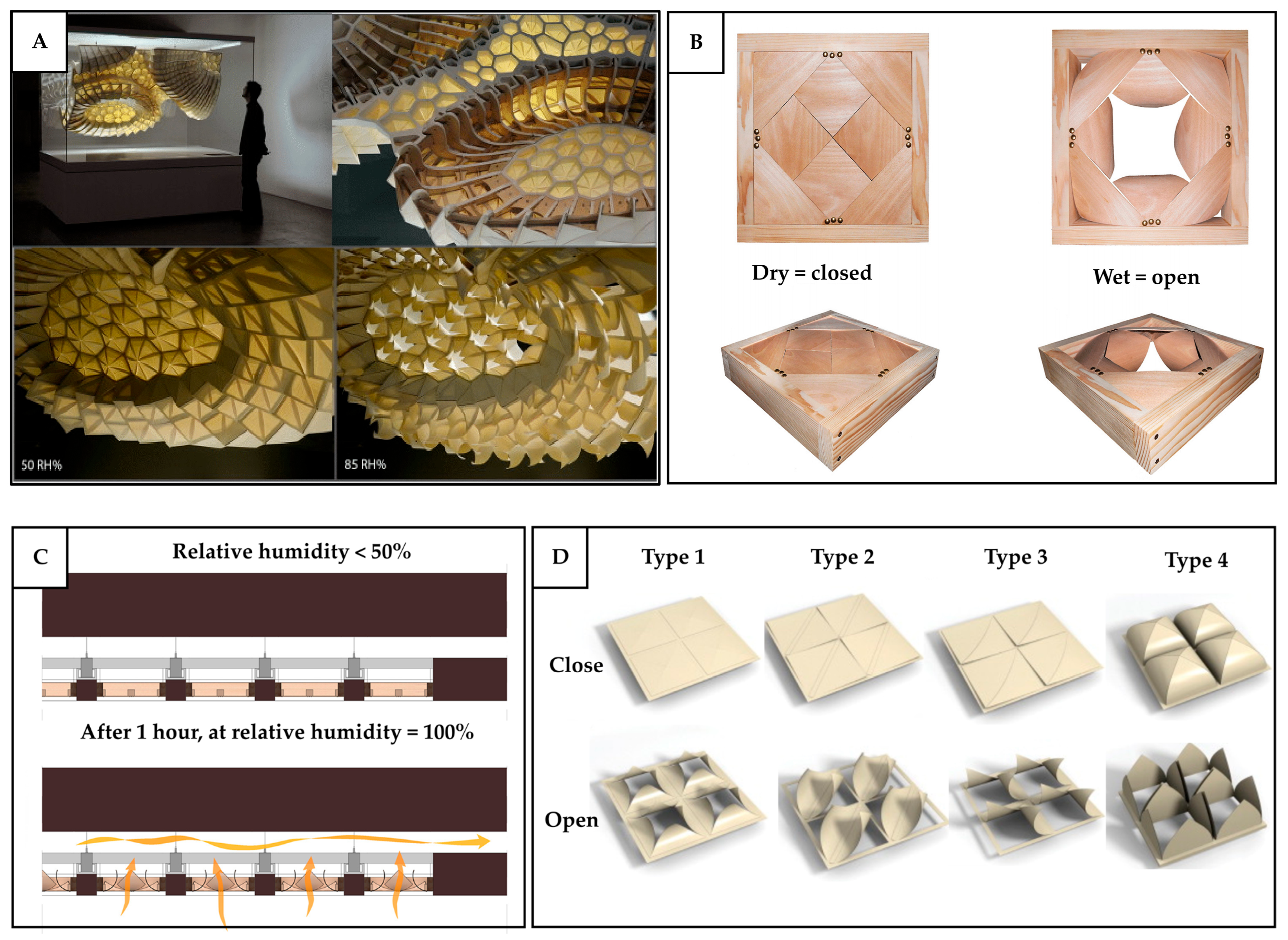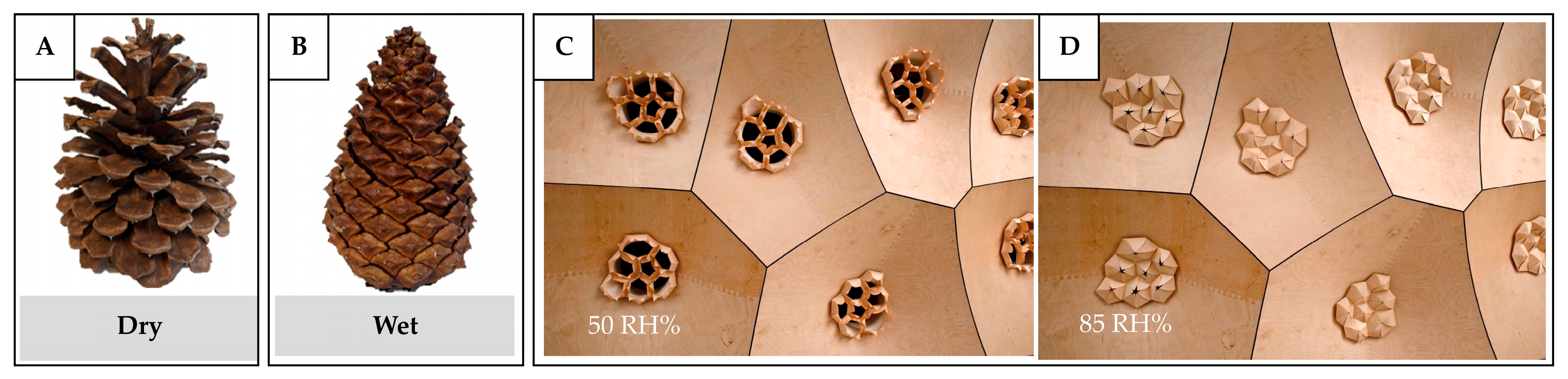 | Responsive to humidity | Envelope element. | The length of the responsive element is limited by the commonly available veneer size, hence limiting the scaling-up size. | Large fluctuations in humidity and temperature increase material degradation; uneven wetting across the grain leads to reduced long-term responsiveness. | Thinner material reacts rapidly to humidity changes, but with shorter response duration. Thicker samples respond more slowly, but they maintain deformation for a longer period once activated. |