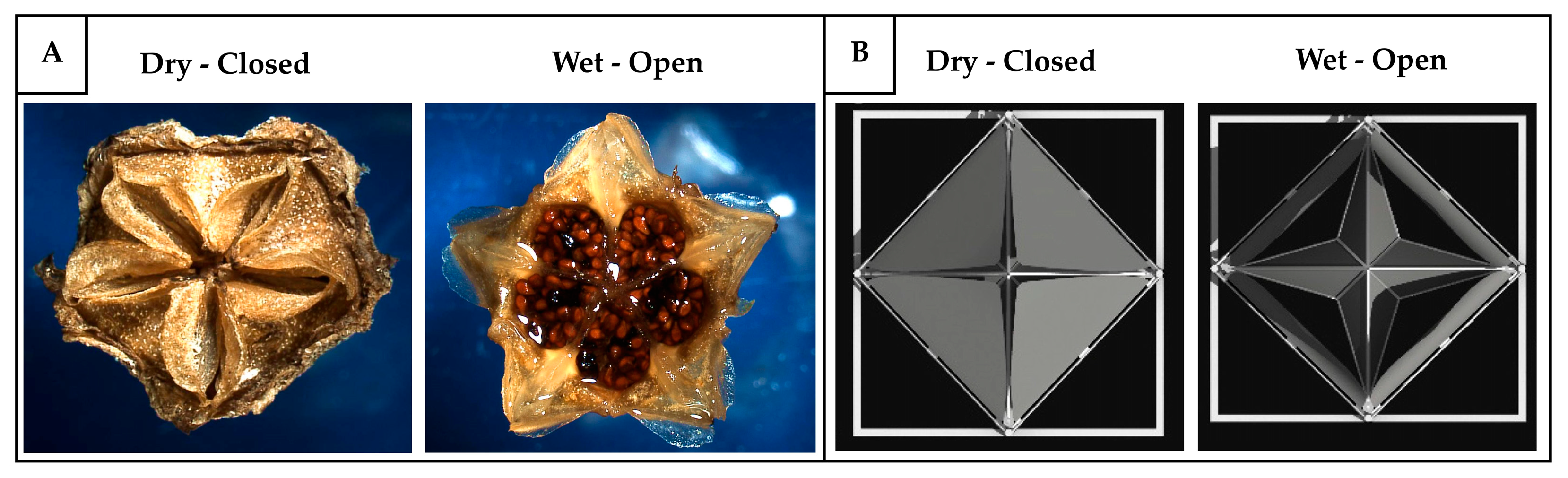 | Pine cone. | Opening and closing of scales. | Adaptive envelope components for ventilation. | Energy-free operation due to autonomous response to humidity changes; lightweight construction; dynamic environmental adaptation. | Limited user control; reduced sensitivity over time from material fatigue; response time influenced by material thickness and size; performance dependent on geometric shape and arrangement. | [187,188,191,192] |