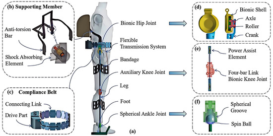 Main Components of the RFCLLE. (a) Component Layout. (b) Load-Bearing Support Structure. This structure comprises a load-bearing frame, an anti-torsion bar, and shock-absorbing elements, each integral to the overall stability and functionality. (c) Adaptive Belt. (d) Hip Joint. (e) Knee Joint. This component features a four-bar bionic structure in conjunction with elastic elements, optimizing mobility and providing essential support during knee extension. (f) Ankle Joint.