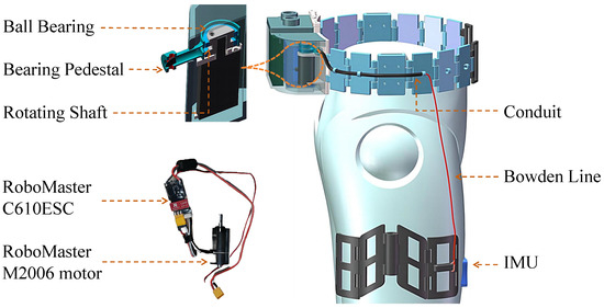 The flexion of the hip joint in the sagittal plane is primarily controlled by the iliopsoas and quadriceps femoris muscle groups [11,16]. To reduce muscle consumption in the hip joint during movement, this study integrates the driving design concept of the flexible wearable exosuit with the RFCLLE, as illustrated in Figure 2. The motor, development board, and power supply are housed within the rear belt and connected to an anchor point located on the front of the thigh, furthest from the hip joint axis, via a Bowden cable. When the hip joint flexes, the torque generated by the motor assists the muscle groups through the anchor point. Conversely, when the hip joint extends, the motor reverses direction, allowing the Bowden cable to return to its initial position under the influence of the leg’s gravity. If the motor reverses too quickly, the Bowden cable may not release in time, resulting in excessive load that could potentially cause the cable to break or damage the motor, thereby posing a risk to the user. To address this issue, we designed a specialized bearing support that incorporates two bearings positioned on either side of the shaft to minimize excess clearance. Additionally, this bearing support serves a guiding function, enhancing the smoothness of the cable retraction process.