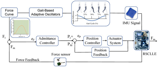 To provide appropriate assistive forces to the human body during motion, this study employs a gait-based adaptive oscillation (AO) method to estimate the percentage phase of walking. The gait-based adaptive oscillator (AO) system, featuring a dual-layer AO architecture, delivers accelerated convergence, enhanced estimation accuracy, and improved stability in gait phase prediction. During continuous gait phases, the proposed gait-based AO matches or surpasses the precision level of conventional AO methods while significantly reducing the synchronization time during non-steady-state walking. This approach does not require model training and enables the synchronization of exoskeleton assistance within two strides, thereby not only reducing the gait learning time but also enhancing the accuracy of predictions accordingly (For detailed research and performance parameters pertaining to gait-based Active Orthoses (AO), readers are referred to prior studies in which some of the authors have participated [31]). Based on the hip joint torque profile originally proposed in Reference [32], the present study introduces an optimized torque curve that not only effectively reduces metabolic consumption but also minimizes the risk of human injury due to excessive torque loading. Finally, the force feedback mechanism and admittance control are integrated to form the control strategy for the entire exoskeleton system, as illustrated in Figure 3.