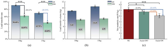 Experimental Results. (a) Load transfer rate. The load transfer rates under dynamic walking and static standing conditions were provided for loads of 10 kg and 15 kg. (b) Load transfer amounts. (c) Metabolic cost. The metabolic consumption of participants under a 15 kg load was analyzed across three conditions: NE, Assist OFF, and Assist ON.