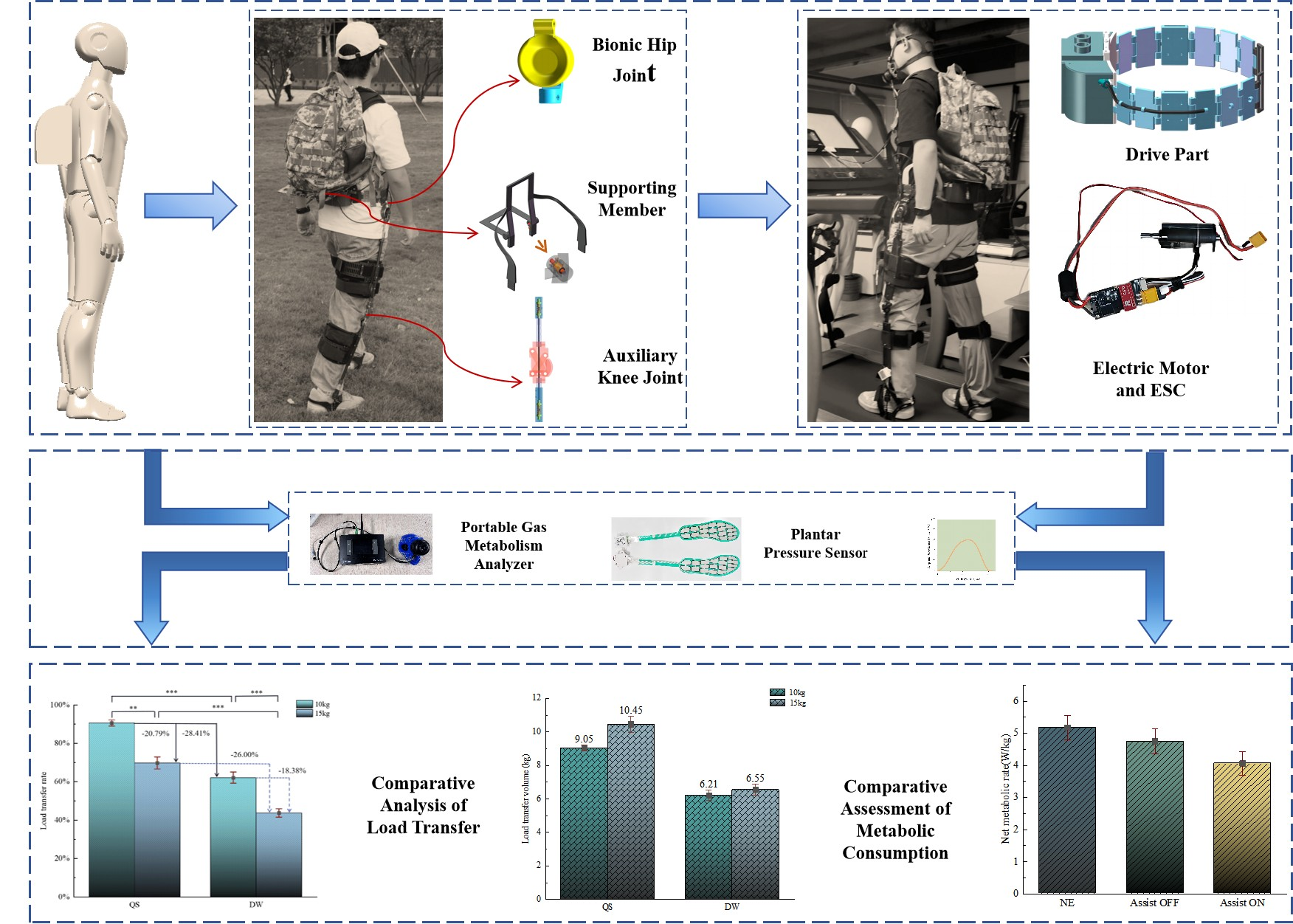 Leveraging the inherent advantages of integrating rigid and flexible structures, we developed the rigid-flexible coupled lower limb exoskeleton (RSCLLE) and implemented a modular design for key components, including the hip, knee, and ankle. Furthermore, we elucidated its operational principles, providing a comprehensive understanding of its functionality. Comprehensive testing of the exoskeleton’s load transfer capabilities and metabolic expenditure performance has been conducted, providing evidence of its substantial efficacy in assisting users during loaded walking scenarios.
