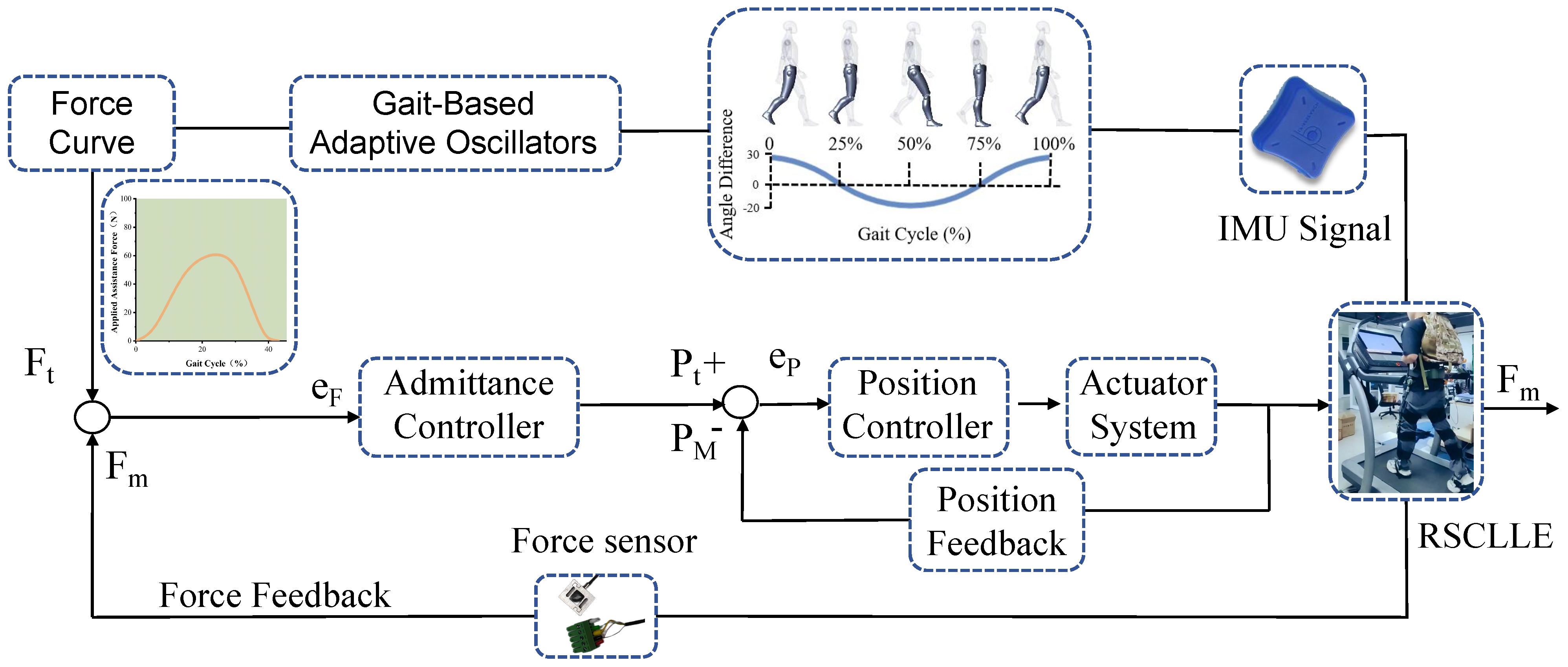 When the RFCLLE is activated, the hip joint angle is initially assessed via the IMU. Subsequently, the assistance force is determined in accordance with the current gait phase and in conjunction with the torque curve.The force sensor integrated within the transmission system transmits the measured assistive force to the admittance controller, which generates the requisite desired motor position based on the error between and . During operation, should the feedback position signal deviate significantly from the desired position , the position controller promptly adjusts the motor to correct this discrepancy. The assistive force generated by this strategy is dynamically calibrated to accommodate variations in the user’s gait characteristics, thereby effectively minimizing metabolic costs.