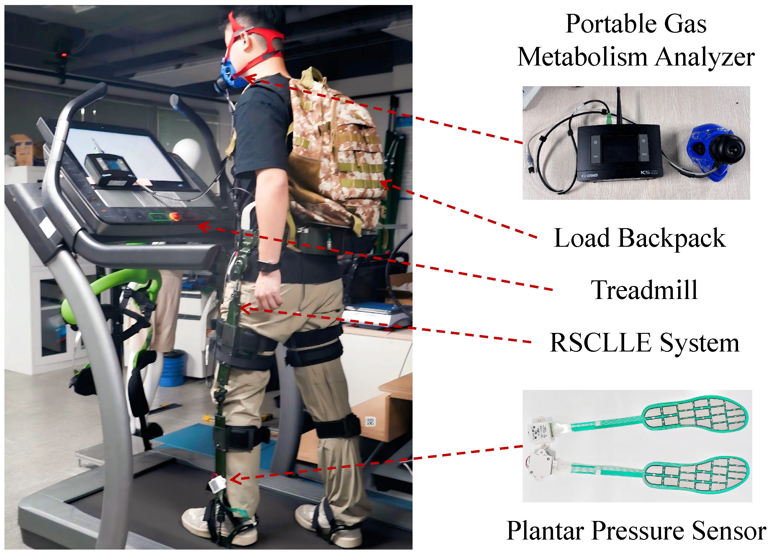 To assess the comprehensive performance of the RFCLLE under load conditions, we recruited eight male participants to engage in experiments examining load transfer and metabolic costs. All experiments were conducted under identical environmental conditions to mitigate the influence of external variables. Recognizing that the subjects’ proficiency with the exoskeleton could influence the level of assistance provided, all participants underwent training on the proper techniques for wearing and utilizing the exoskeleton prior to the experiments [