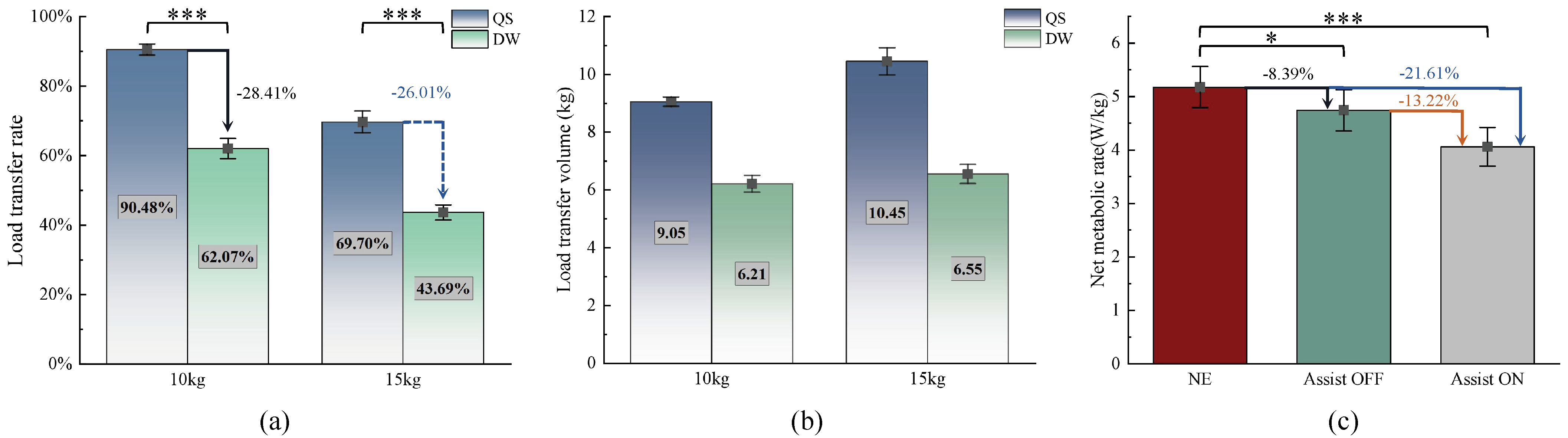 23]. Concurrently, Yu’s team reported a more substantial 13.1% reduction in metabolic cost; nevertheless, their work did not include an evaluation of the device’s load transfer performance [