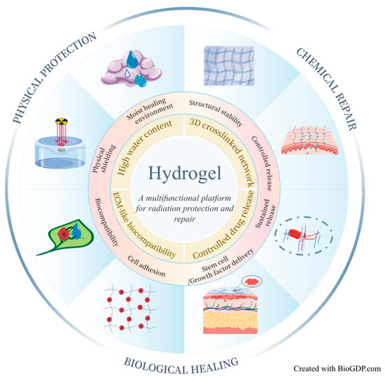 Current radioprotective agents for the skin primarily rely on chemical repair mechanisms, and no physical protective material has yet been developed that can effectively shield low-energy radiation. As a polymeric network system [45], hydrogels possess exceptional water-retention capacity, allowing them to serve as benign physical barriers that mitigate the effects of low-energy ionizing radiation, while remaining adherent to tissue surfaces for extended periods. Moreover, they can be engineered to encapsulate growth factors, stem cells, and other bioactive substances [46,47,48], ensuring sustained release, enhanced bioavailability, and combined protective and therapeutic effects. These attributes position hydrogels as strong candidates for the next generation of radioprotective agents with considerable developmental promise. As shown in Figure 3, hydrogels exert synergistic effects in protecting and repairing RISI through multidimensional mechanisms—including physical shielding, chemical repair, and biological healing—offering a novel concept that integrates protection and therapy.
