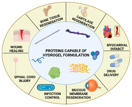 Typical proteins used for hydrogel construction and their multifield biomedical applications. Reproduced from Katona et al. [84], under the CC BY 4.0 license.