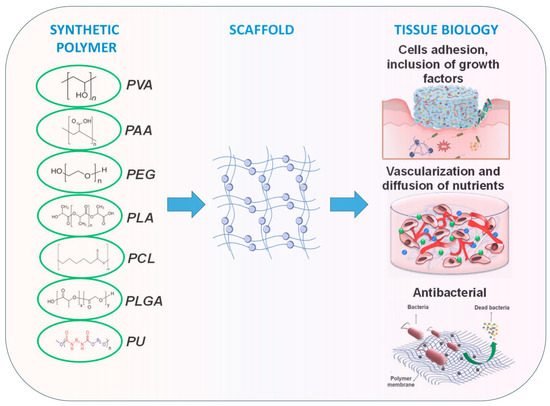Synthetic polymers applied in wound healing and skin tissue engineering. Adapted from Avadanei-Luca et al. [107], under the CC BY 4.0 license.