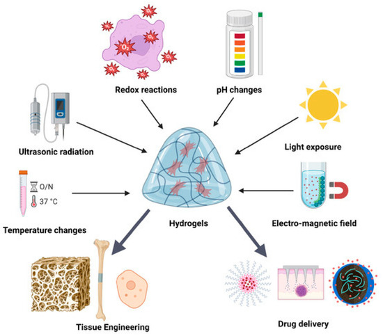 Schematic illustration of the regulation of smart hydrogel biological functions by various external stimuli. Reproduced from Munteanu et al. [132], under the CC BY 4.0 license.