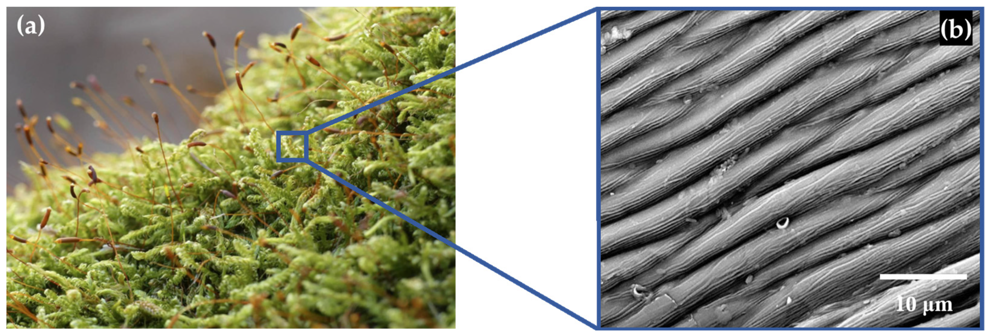 Hypnum cupressiforme). This type of surface in nature exhibits significant hydrophilic properties (see