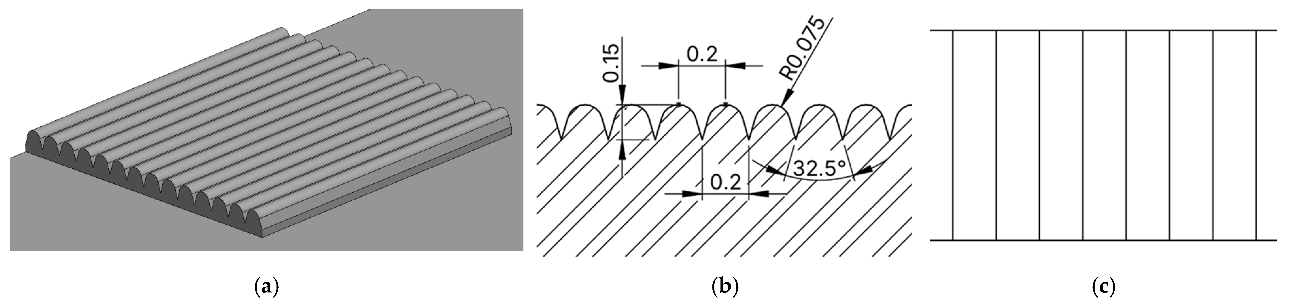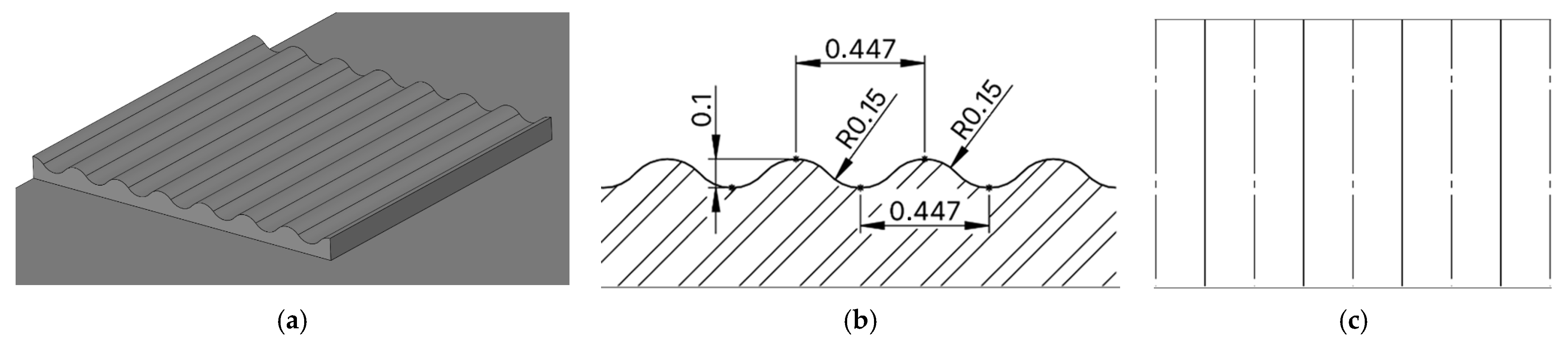 The dimensions of the selected profile were as follows: relief depth 0.1 mm, spacing between individual waves 0.447 mm, and arc radius in 0.15 mm (see