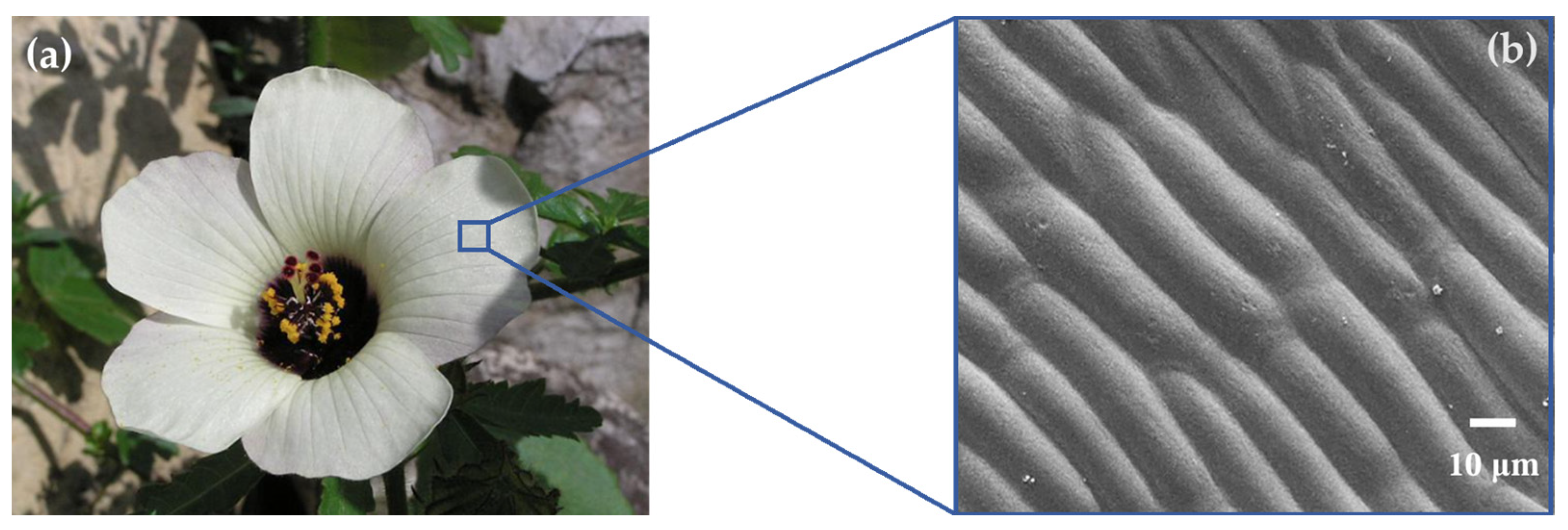 Hibiscus trionum). Unlike moss, the surface structure on the petals repels water and thus exhibits significant hydrophobic properties (see