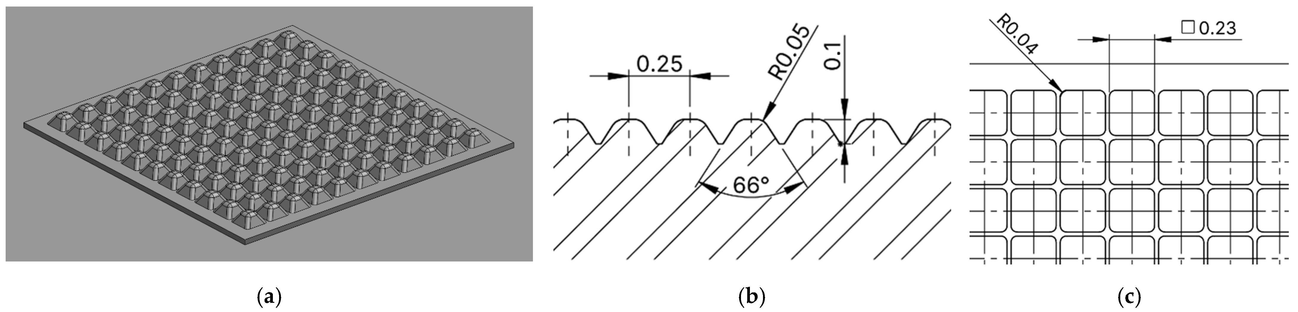 Micro-milling is a machining technique that can be used to create micro 3D shapes, reliefs, etc., with the required precision. This technology was selected because it is experimentally accessible through conventional CNC equipment, allows direct machining of metal base mold inserts, and enables rapid modification of surface topologies while maintaining high-dimensional accuracy and repeatability. However, micro-milling inherently limits the minimum achievable feature size to the order of tens of micrometers due to tool geometry. As a result, nanoscale hierarchical details typical of biological surfaces cannot be reproduced. These limitations can be overcome by alternative high-resolution texturing methods such as femtosecond-laser micromachining or lithographic nanoimprinting.