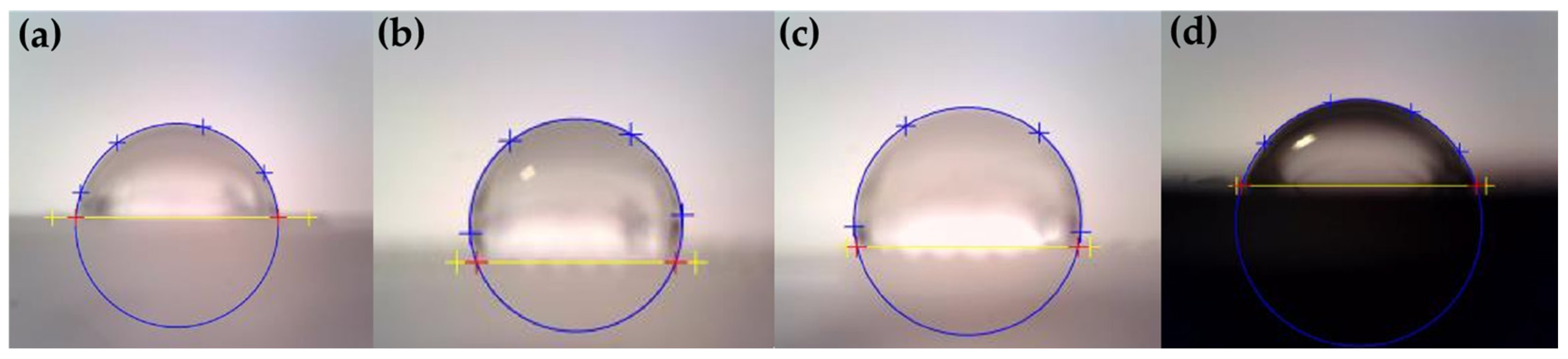 Figure 7). Contact angle measurements were performed on five test samples for the selected technological parameters, polymer materials, and designed and replicated reliefs.