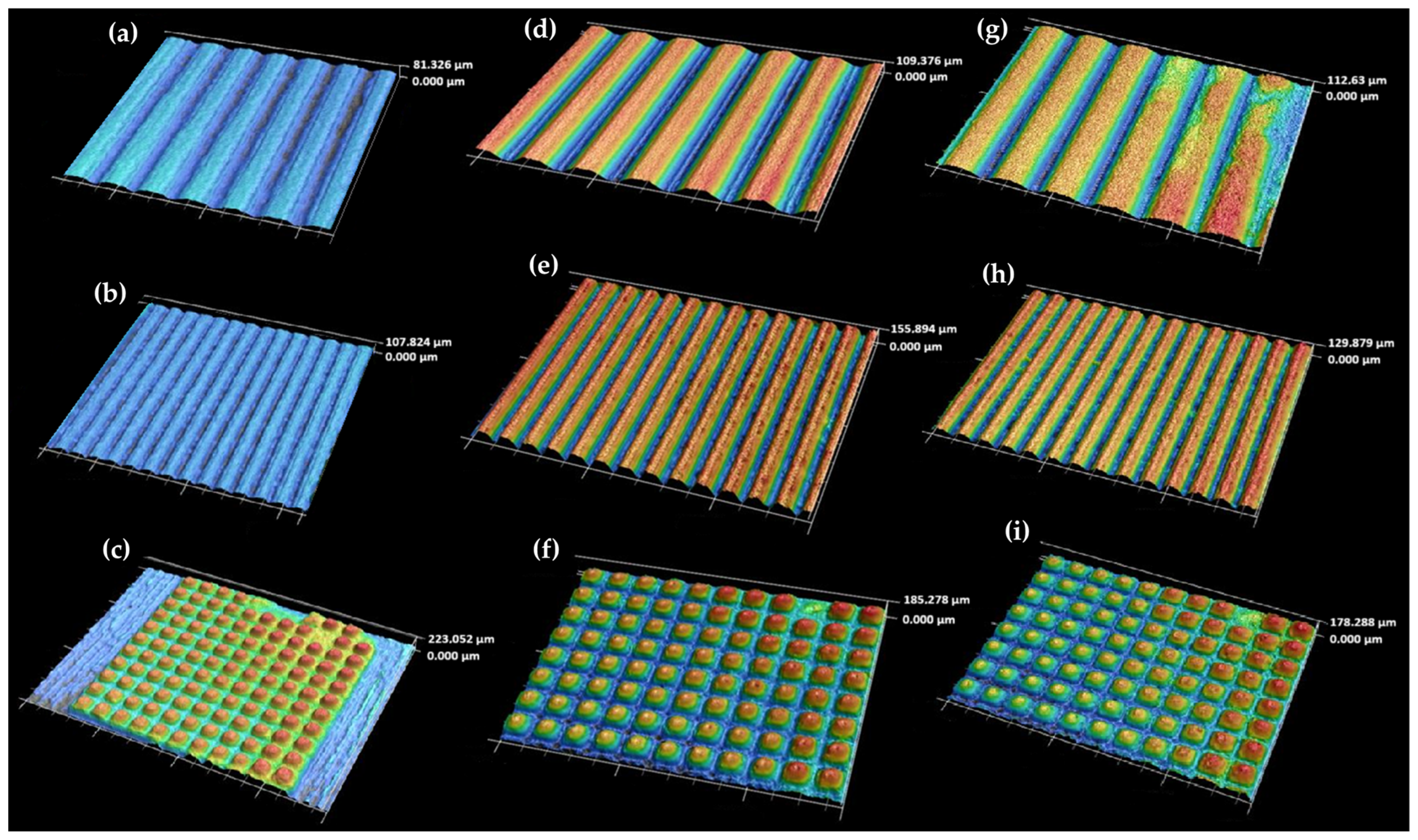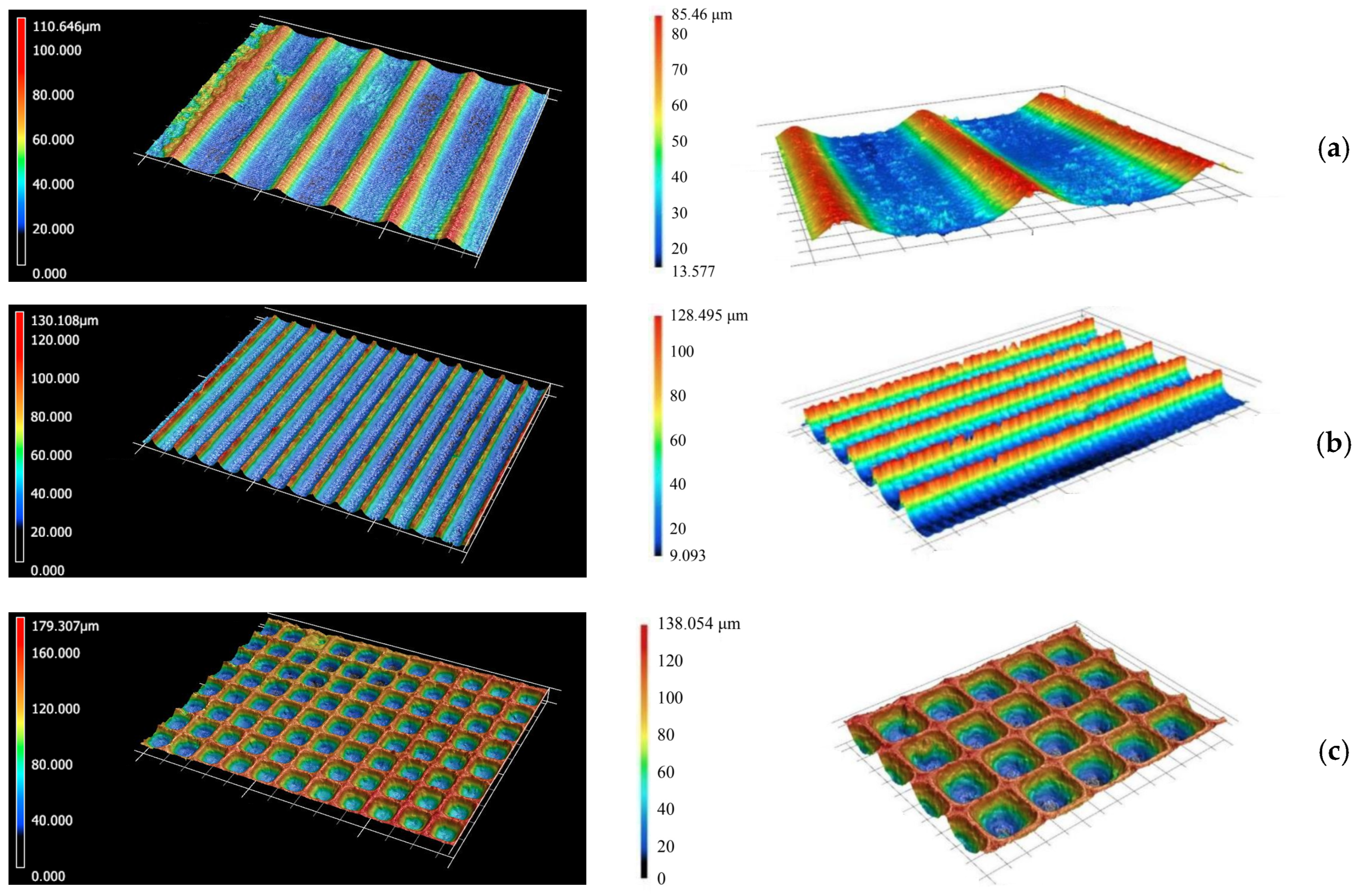 Section 2.3) to eliminate any damage or destruction of the relief. Images from confocal microscopy of the microstructures created on the surface of the mold cavity are shown in